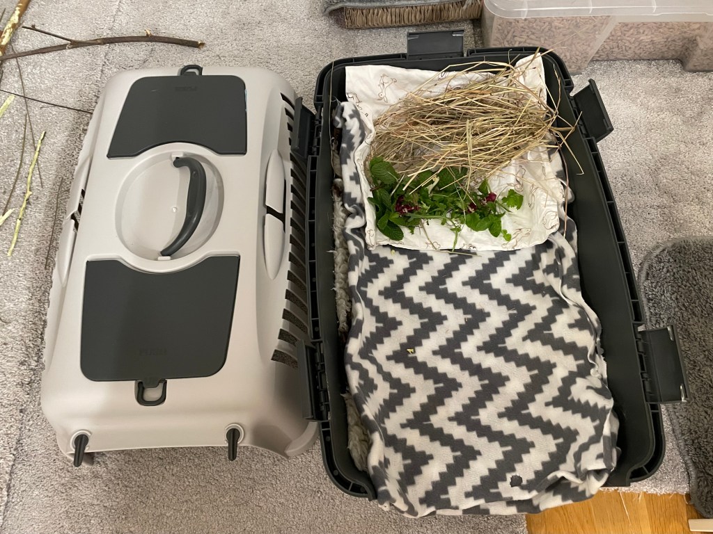 - Se till att transportväskan är tillräckligt stor för att kaninerna ska kunna vända sig på ett bekvämt sätt, men inte för stor. Vår har storleken 55x35x36 cm och är i hårdplast.