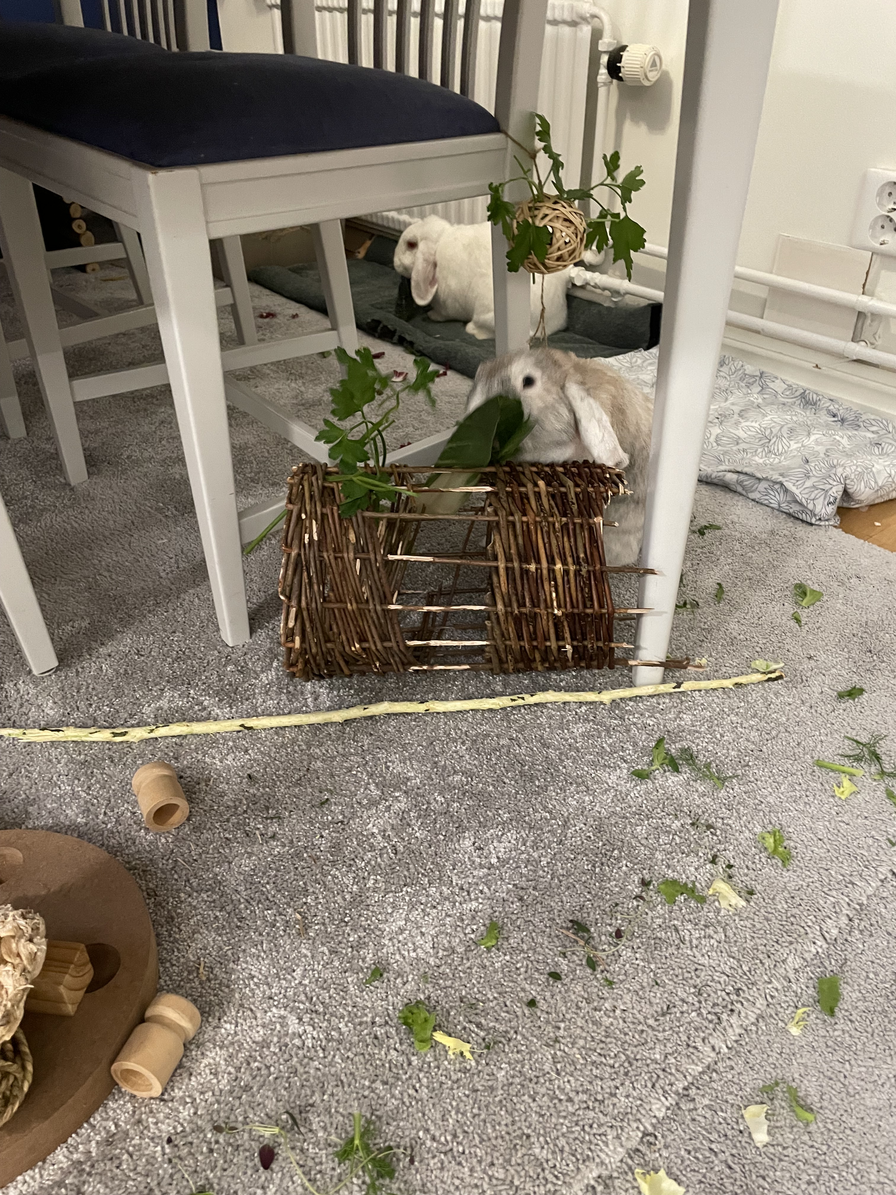 We have a wicker tunnel where we hide various herbs and leaves, creating another spot for the rabbits to enjoy their food. Often, they stand with their front paws on the tunnel and pull out the food they want to eat. This method is usually preferred over eating the same food that’s readily available on the floor.